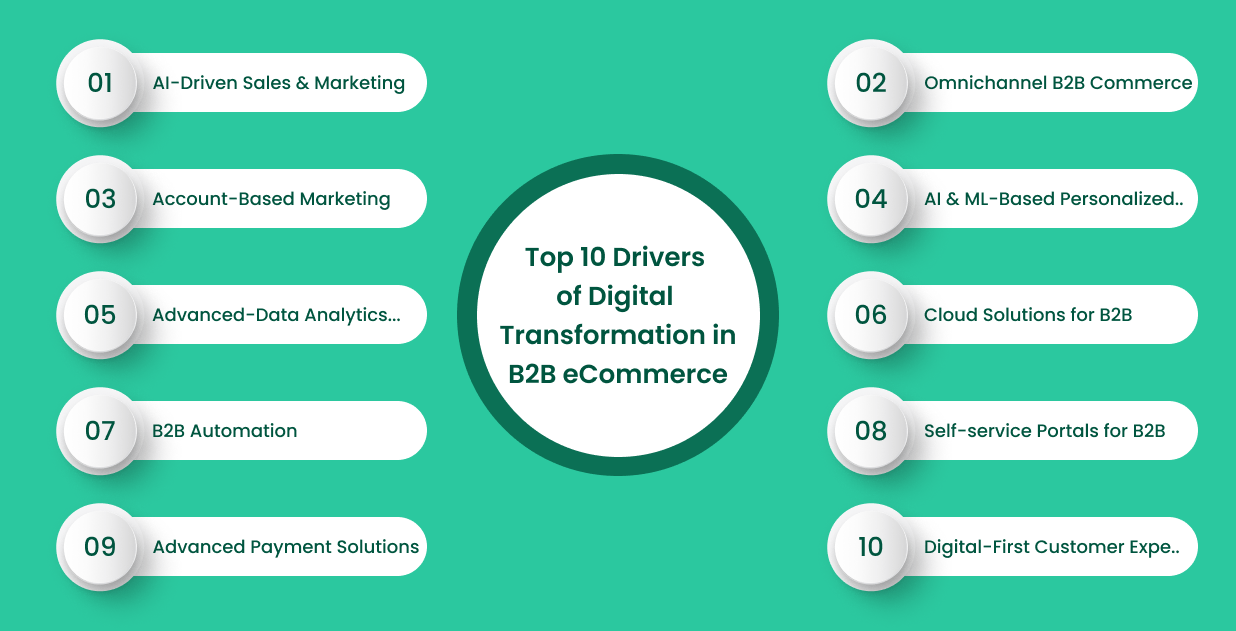 The above stat depicts that the B2B eCommerce space has become more dynamic and competitive. To stay ahead of the curve, consider the key drivers that empower your digital transformation journey.