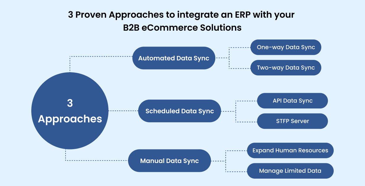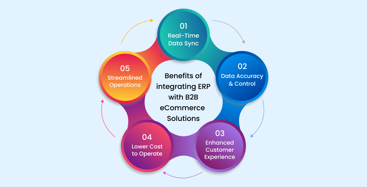 ERP integration with a B2B eCommerce solution ensures your business operations work in sync. Effective integration provides various business benefits, including efficient data synchronization, smooth data flow, and advanced automation.