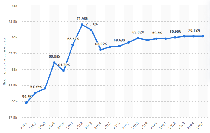According to Statista, in 2025, the online shopping cart abandonment rate worldwide will be 70%